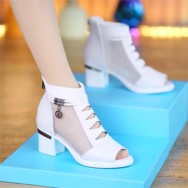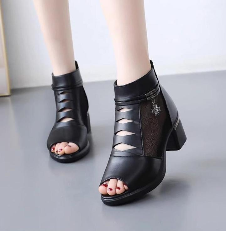 【35-40】2025 Vară stil nou toc gros gura de pește plasă sandale respirabile goale